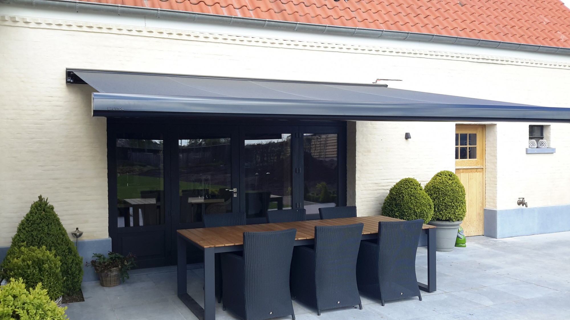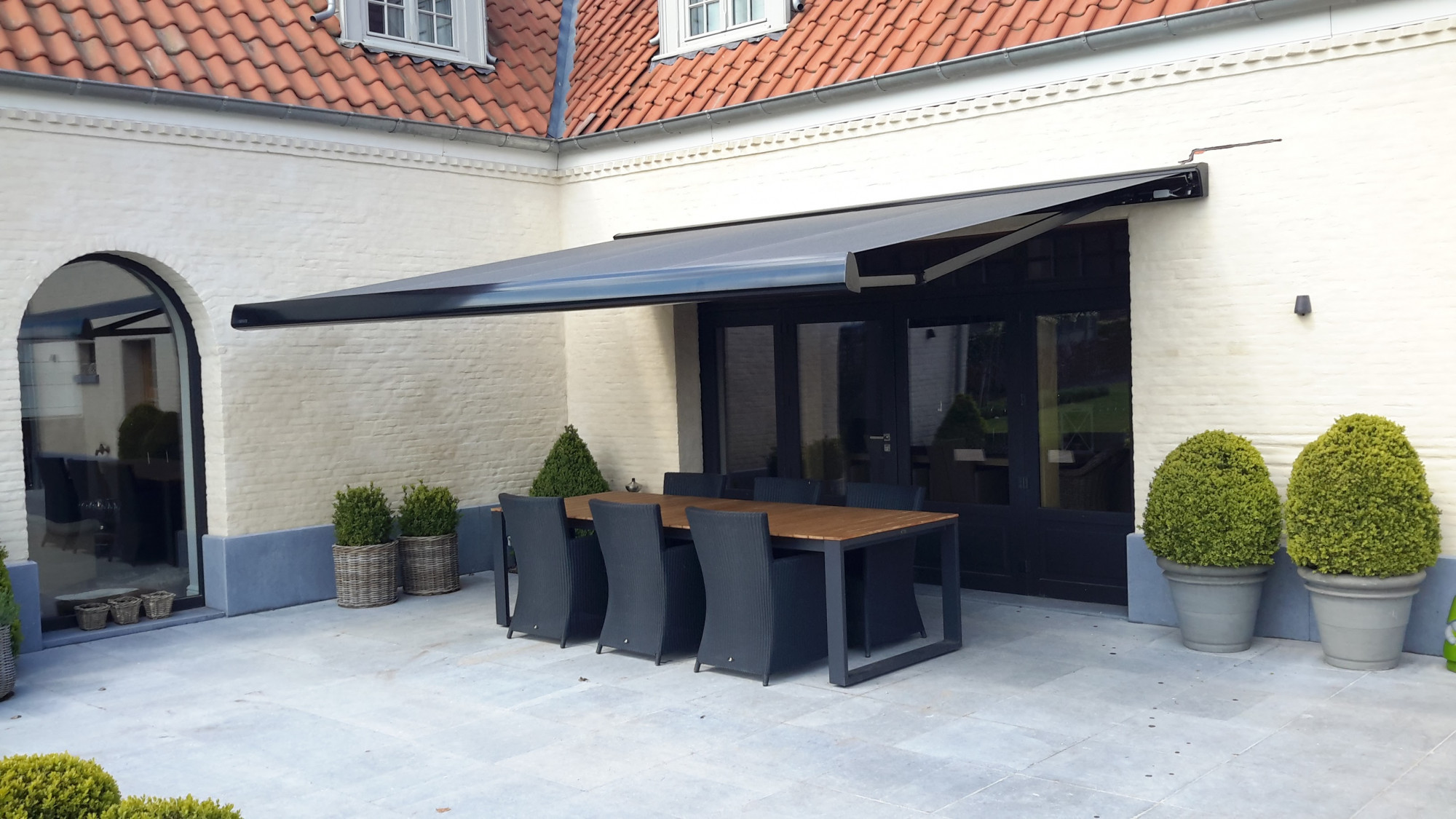 De B35 is een groot en robuust knikarmscherm met uitval tot 4 meter.