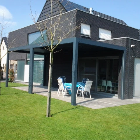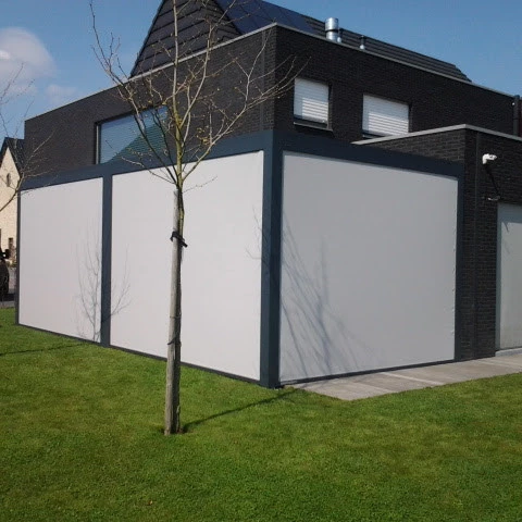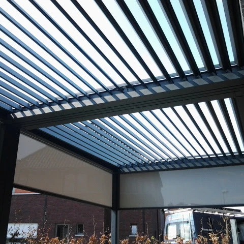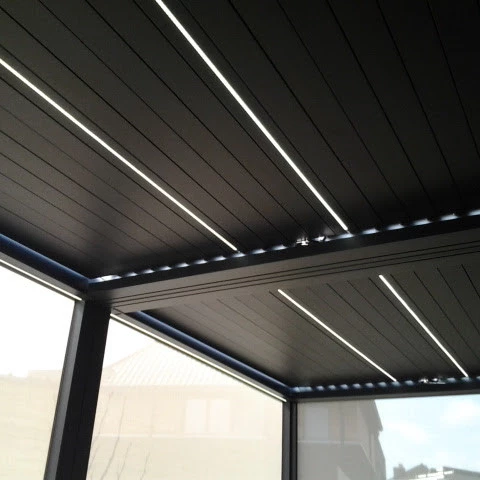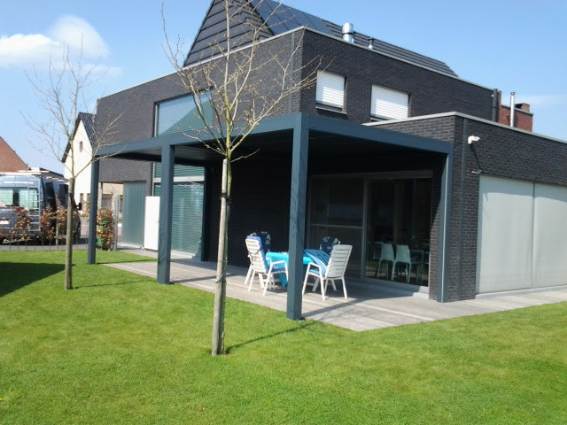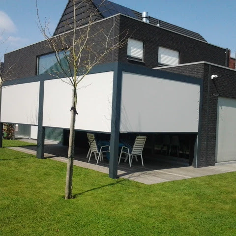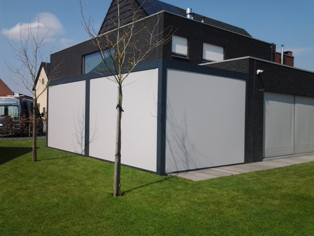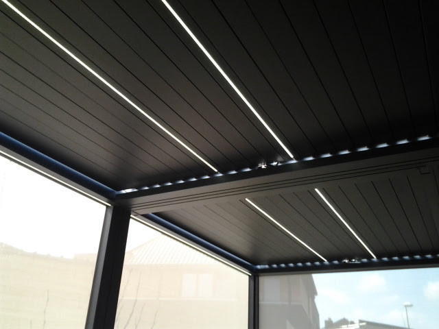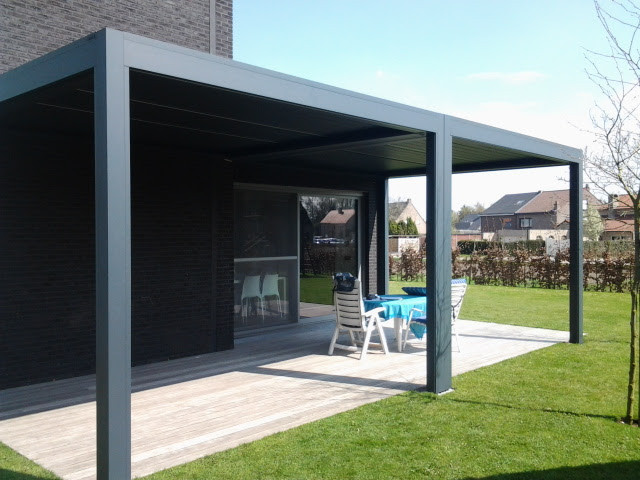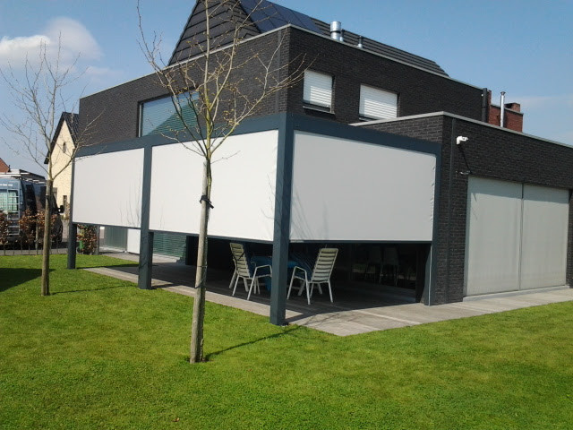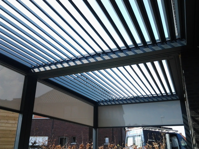 Plaats zat onder deze twee aan elkaar gekoppelde Brustor B200 terrasoverkappingen. Met het dak dicht en de screens neer, hebben ze er hier een grote kamer bij. Ledstrips in een aantal lamellen zorgen voor stijlvolle verlichting.